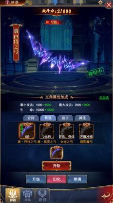 可在“神器”界面选择进入幻化功能界面,在“幻化”里界面里根据武器品质的不同,从低到高分为史诗、传说、远古、神圣,每一件武器都有种不一样的华丽外观,品质高的武器外观效果也更为酷炫,尤其亮闪闪的各种光效炫爆全场,颜值高还属性好,无论对颜值党还是追求实力的朋友,都值得入手。