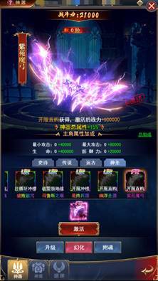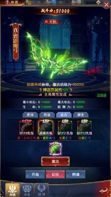 可在“神器”界面选择进入幻化功能界面,在“幻化”里界面里根据武器品质的不同,从低到高分为史诗、传说、远古、神圣,每一件武器都有种不一样的华丽外观,品质高的武器外观效果也更为酷炫,尤其亮闪闪的各种光效炫爆全场,颜值高还属性好,无论对颜值党还是追求实力的朋友,都值得入手。