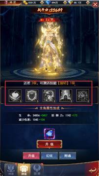 先说神装升级,需消耗“神装升级石”来强化,可为角色增加大量属性,并且升级达到一定等级,可激活或升级神装技能,神装技能有:强韧、坚甲、护心、顽强、回生5个技能。消耗的“神装升级石”可通过日常副本、限时特惠等途径获取。
